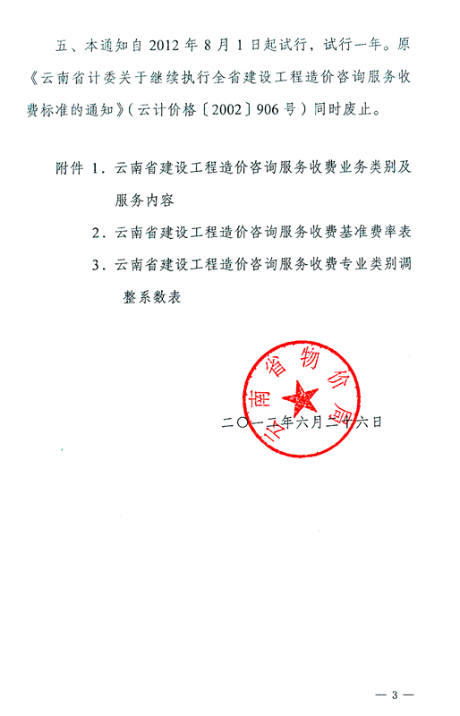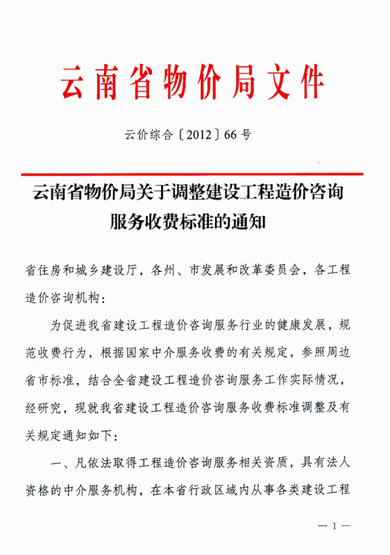 云南省物價局關(guān)于調(diào)整建設(shè)工程造價咨詢服務(wù)收費標準的通知 云價綜合[2012]66號