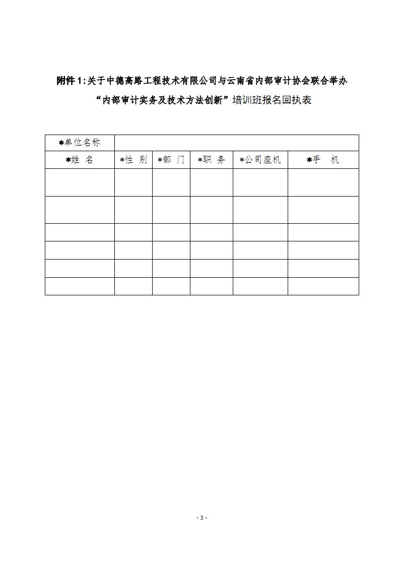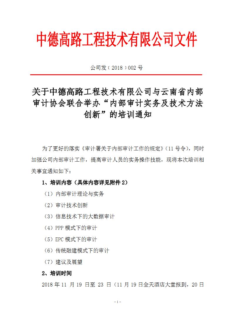 關于中德高路工程技術有限公司與云南省內部審計協(xié)會聯(lián)合舉辦“內部審計實務及技術方法創(chuàng)新”的培訓通知