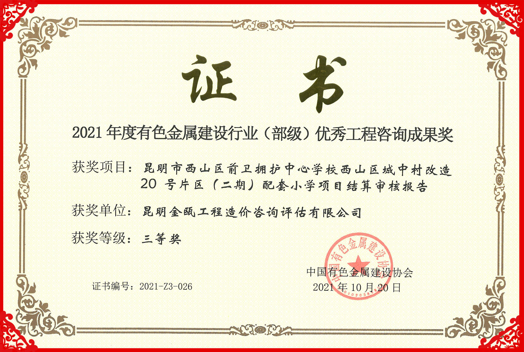 熱烈祝賀昆明金甌工程造價(jià)咨詢?cè)u(píng)估有限公司在2021年度中國(guó)有色金屬建設(shè)行業(yè)咨詢成果評(píng)獎(jiǎng)活動(dòng)中