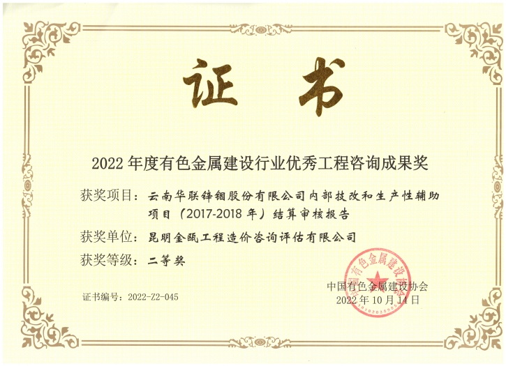 昆明金甌工程管理咨詢(xún)有限公司在2022年度有色金屬建設(shè)行業(yè)獲獎(jiǎng)情況