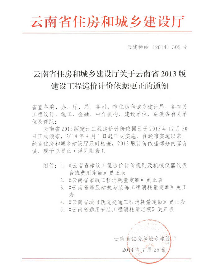 云南省住房和城鄉(xiāng)建設(shè)廳關(guān)于云南省2013版建設(shè)工程造價計價依據(jù)更正的通知
