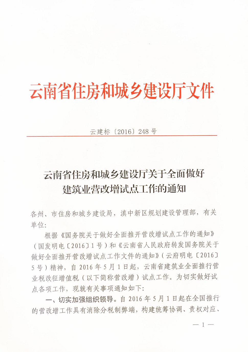 關(guān)于全面做好建筑業(yè)營改增試點工作的通知 云建標[2016]248號