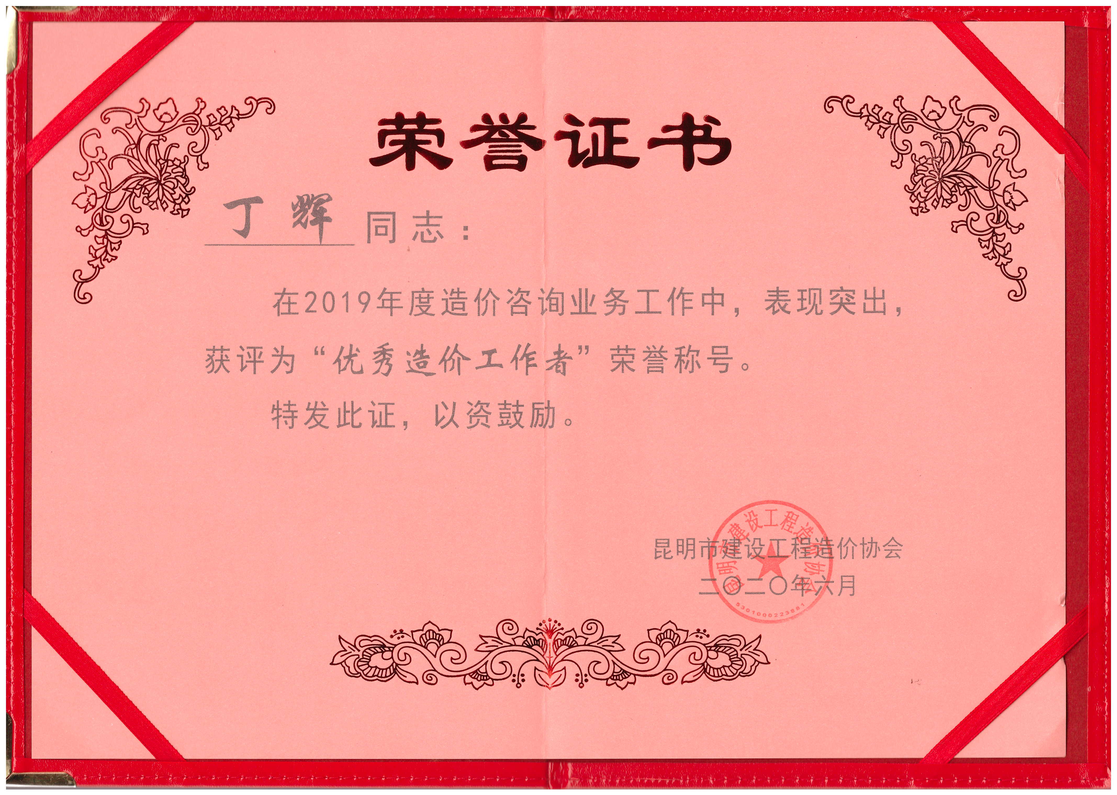 祝賀丁輝、李春宇同志榮獲2019年度“優(yōu)秀造價工作者”